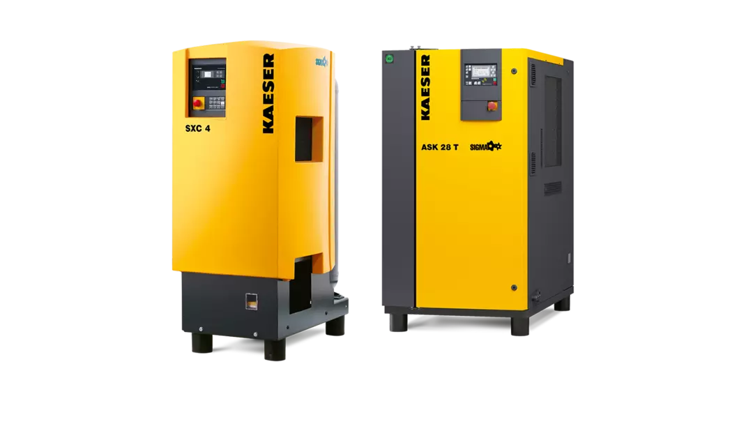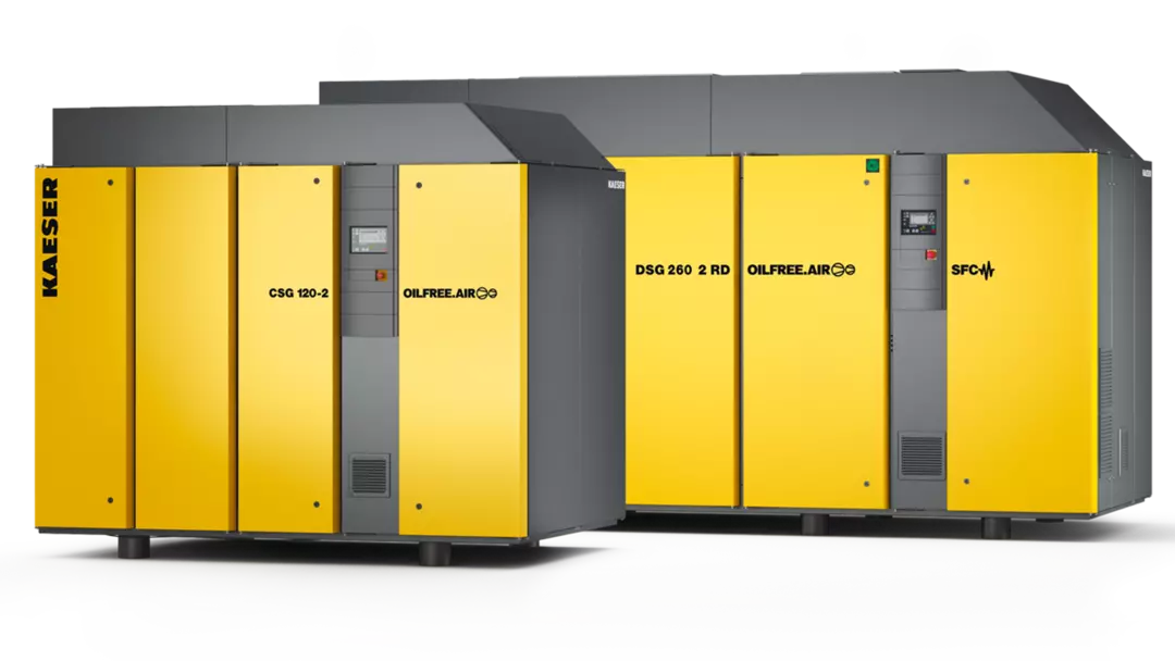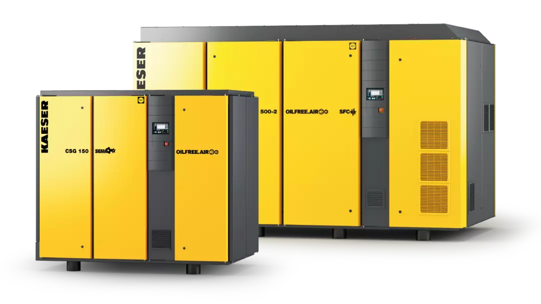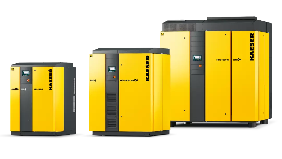 KAESER's patented SIGMA PROFILE rotors set the global standard for compressed air efficiency. Available with fluid cooling (oil-injected) and oil-free compression variants, these compressors deliver exceptional performance across a wide range of pressures and flow rates. The SIGMA CONTROL 2 onboard controller ensures intelligent, reliable operation — 24/7, 365 days a year.