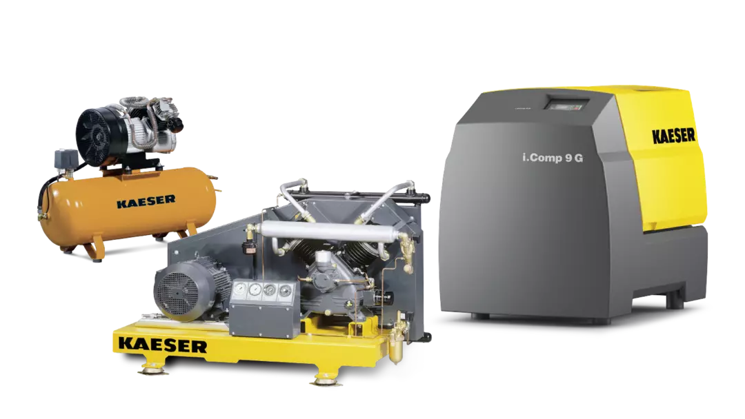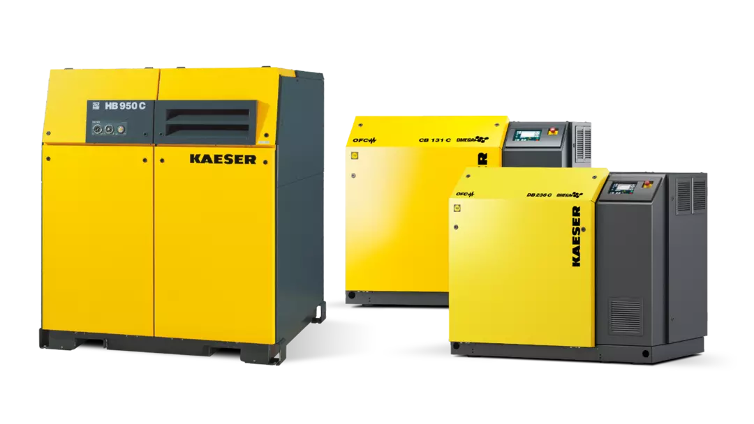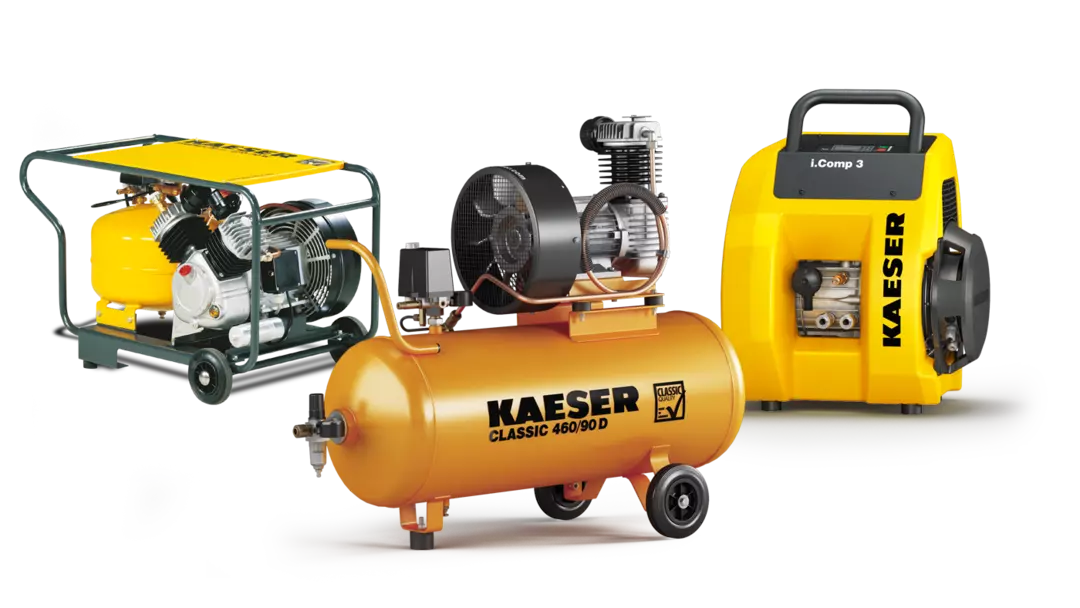 KAESER reciprocating (piston) compressors cover an exceptionally wide range — from small workshop units to high-pressure industrial boosters. Available in portable and stationary configurations, complete ready-to-use packages, and OEM blocks. Engineered for reliability in demanding duty cycles where high pressure is required.