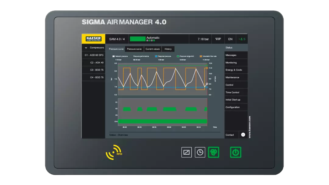 KAESER controllers bring intelligent automation to your compressed air station. The SIGMA CONTROL 2 onboard controller manages individual compressors, while the SIGMA AIR MANAGER (SAM 4.0) coordinates entire compressed air networks — continuously optimising energy consumption, monitoring performance, and enabling remote diagnostics and reporting.